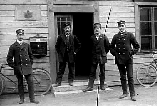 POSTILJONER UTANFÖR POSTKONTORET. PÅ TRAPPAN EN JÄRNVÄGSTJÄNSTEMAN.