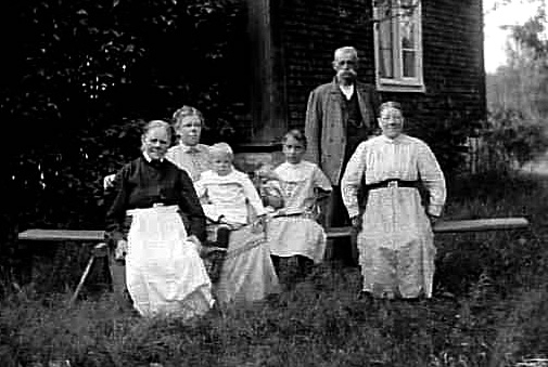 TRE KVINNOR SITTANDE PÅ EN BÄNK, TVÅ BARN OCH EN MAN BAKOM DEM.