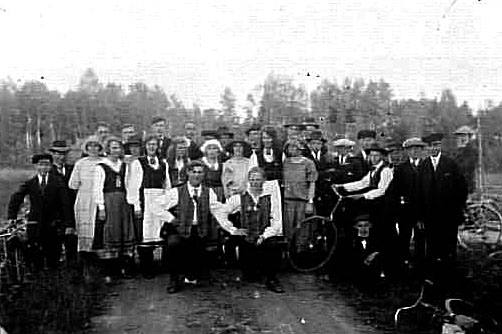 EN SAMLING MÄNNISKOR I LYRESTAD EN DEL HAR FOLKDRÄKT PÅ SIG, OSKAR EKSELL, LÄNGST FRAM TILL VÄNSTER OCH JOHN JOHNSSON TILL HÖGER ÄR KLÄDDA I RANDIGA VÄSTAR.