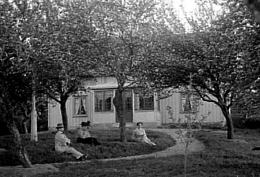 EN MAN OCH TVÅ KVINNOR SITTER PÅ GRÄSMATTAN FRAMFÖR ETT BOSTADSHUS.