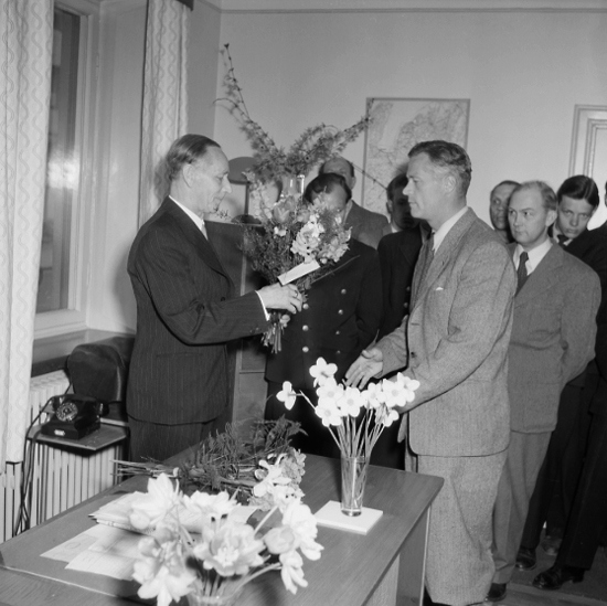 Postmännen Evald Gustafsson och Ragnar Käll med flera avtackar.
