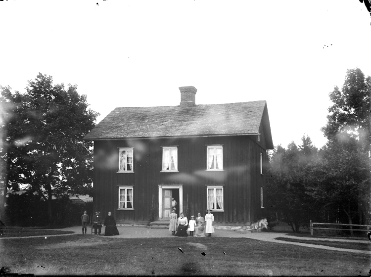 Högt tvåvåningshus med sällskap på gårdsplanen.