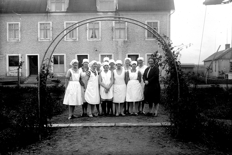 Fru Håkansson med elever vid Hushållsskolan, Stridsborg i Kvänum.