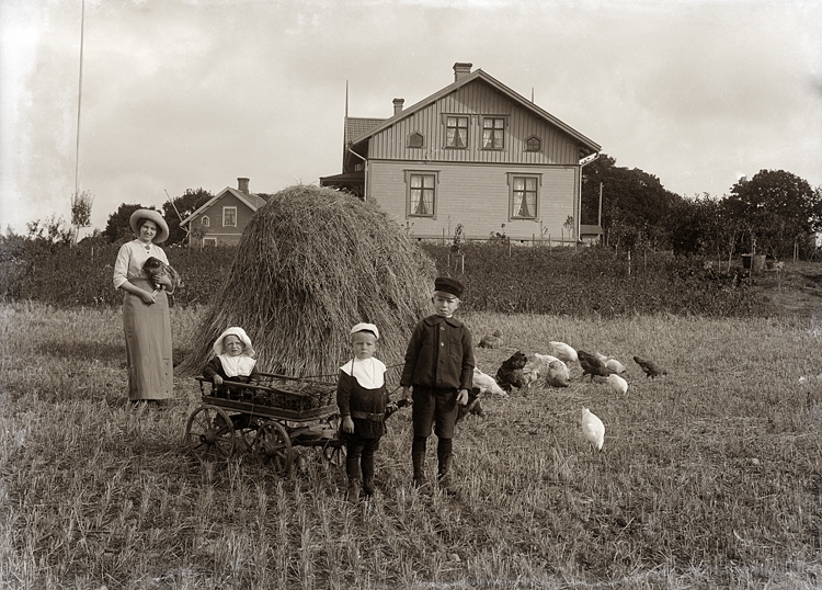 Fru Johansson och barnen samt några höns på en åker intill skolhuset.