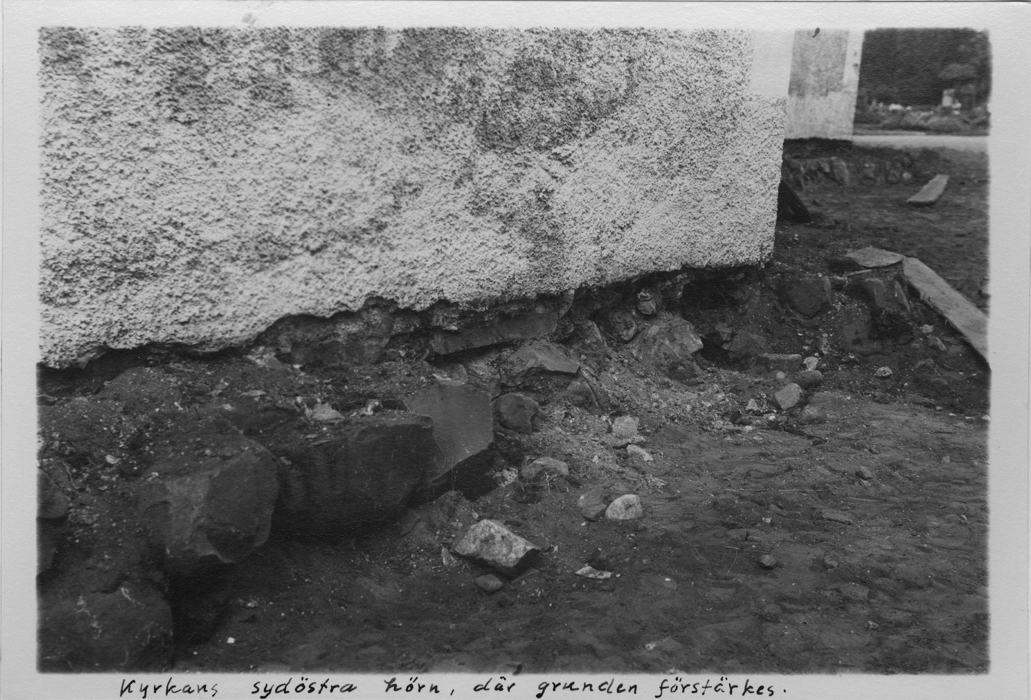 Kyrkans sydöstra hörn, där grunden förstärkts.