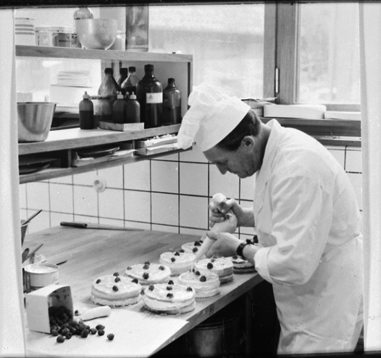 Konditor Harry "Nocke" Svantesson garnerar tårtor, 1962.
