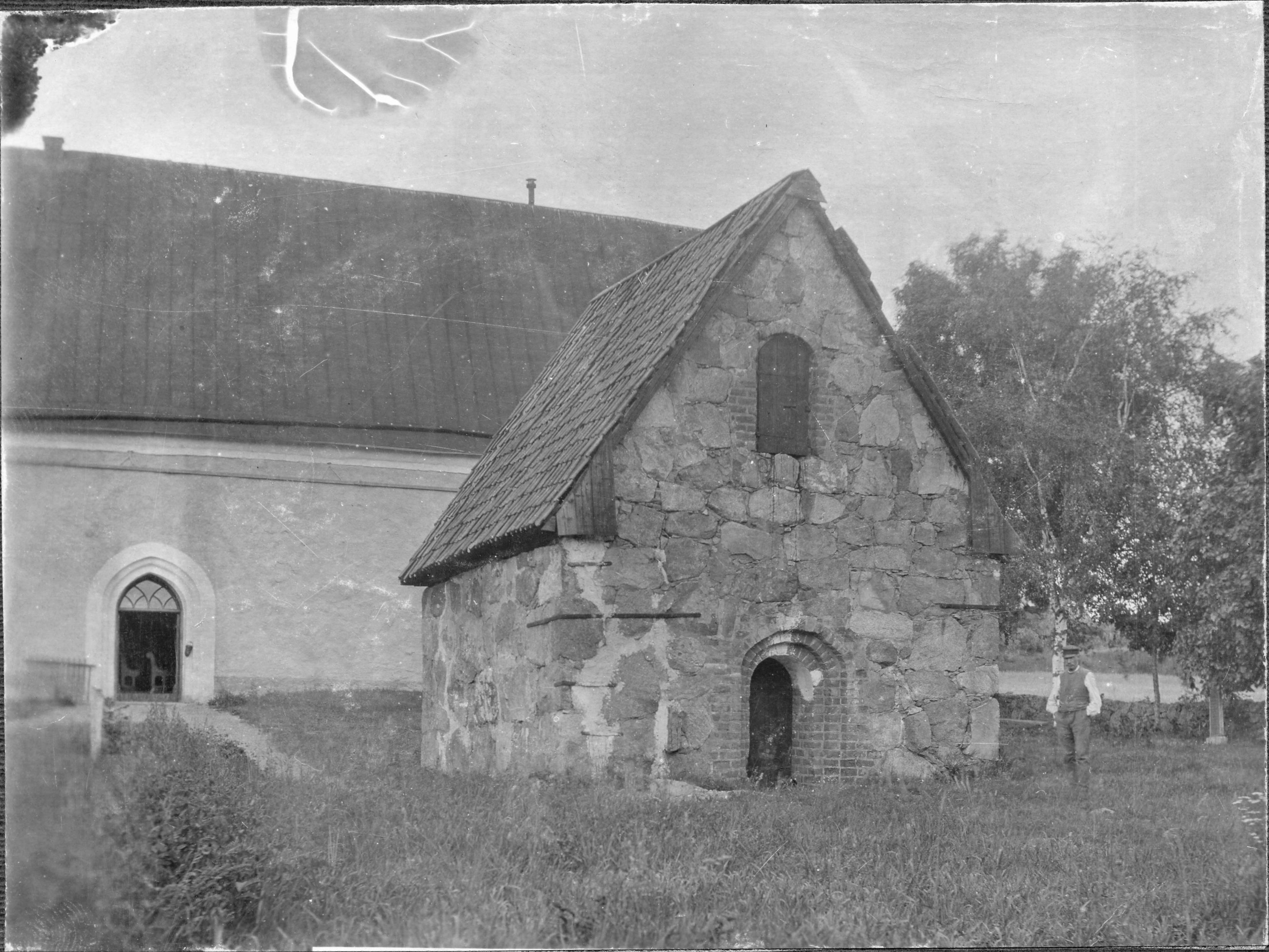 Kyrkan mot söder med fristående sakristia, 1200-talet, i förgrunden.