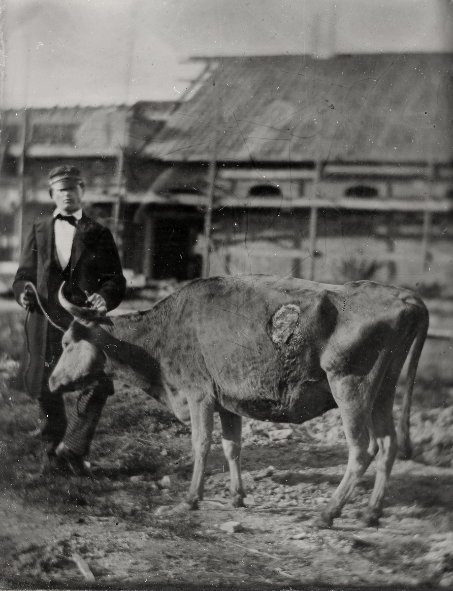 Sjuk ko framför stall