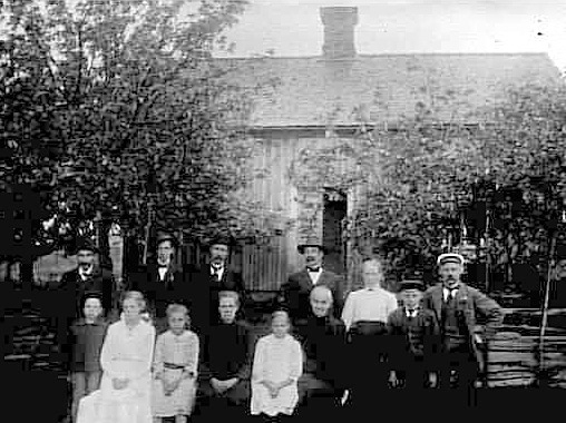 EN GRUPP MÄNNISKOR FRAMFÖR ETT BOSTADSHUS SANNOLIKT EN SLÄKTGRUPP.