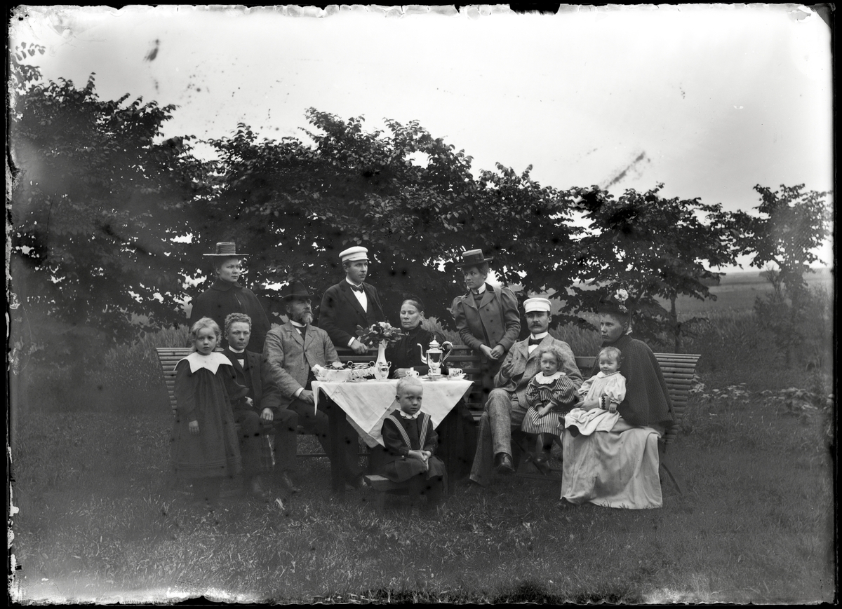 Familj samlad i trädgård