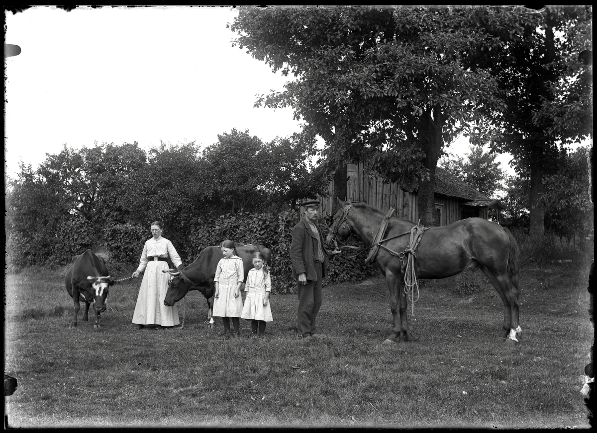 Familj poserar med sina kreatur