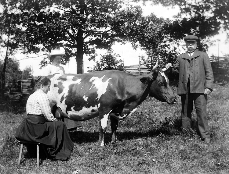 EN KVINNA SITTER PÅ EN PALL OCH HANDMJÖLKAR EN KO.
