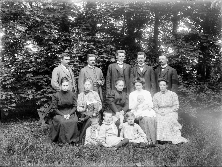 Fem damer, fem herrar och fem barn. Stora träd i bakgrunden.