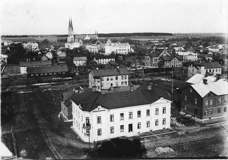 Skara station vid sekelskiftet 1800 - 1900-talet. Det första stationshuset står fortfarande kvar framför det nya. Det bortfördes strax före invigningen av linjen Skara-Göteborg. Längst till vänster återfinner man det första godsmagasinet.