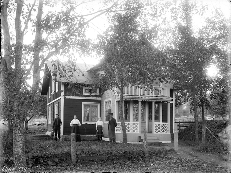 Två damer, två herrar framför villa med stor veranda.