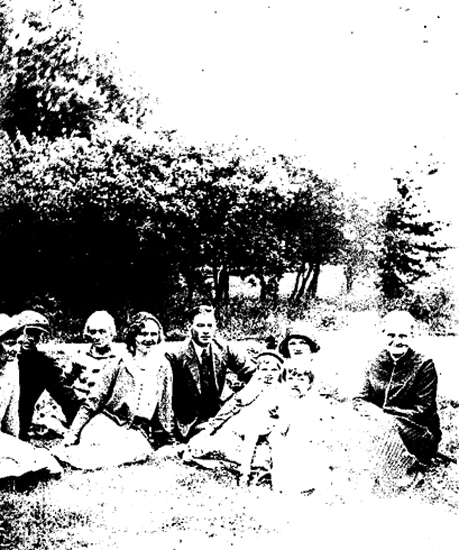 Elisabeth Jansson, Eric Jansson, Berta Andersson, Kerstin Jansson, Gunnar Andersson, Karin Andersson med Brita och Anita i knäet, mormor Alma Jansson längst till höger.
