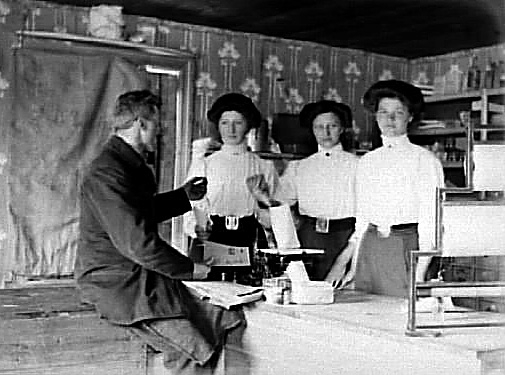 FYRA MÄNNISKOR I EN LANTHANDEL.