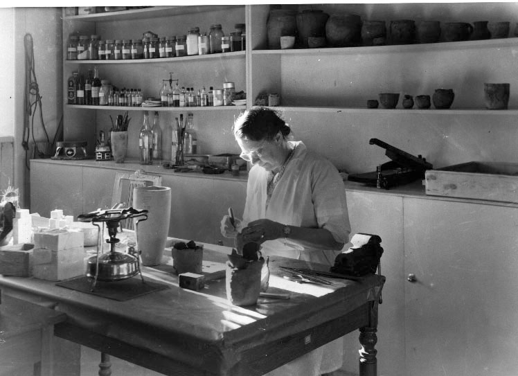 Konservator Beda Westman i arbete med att hopsätta lerkäl från en utgrävd stenåldersgrav. Kärlen ha i 25 år väntat på konservering. En gemensam konserveringsanstalt för Västergötlands och Dalslands museer har etablerats med Landstings stöd.