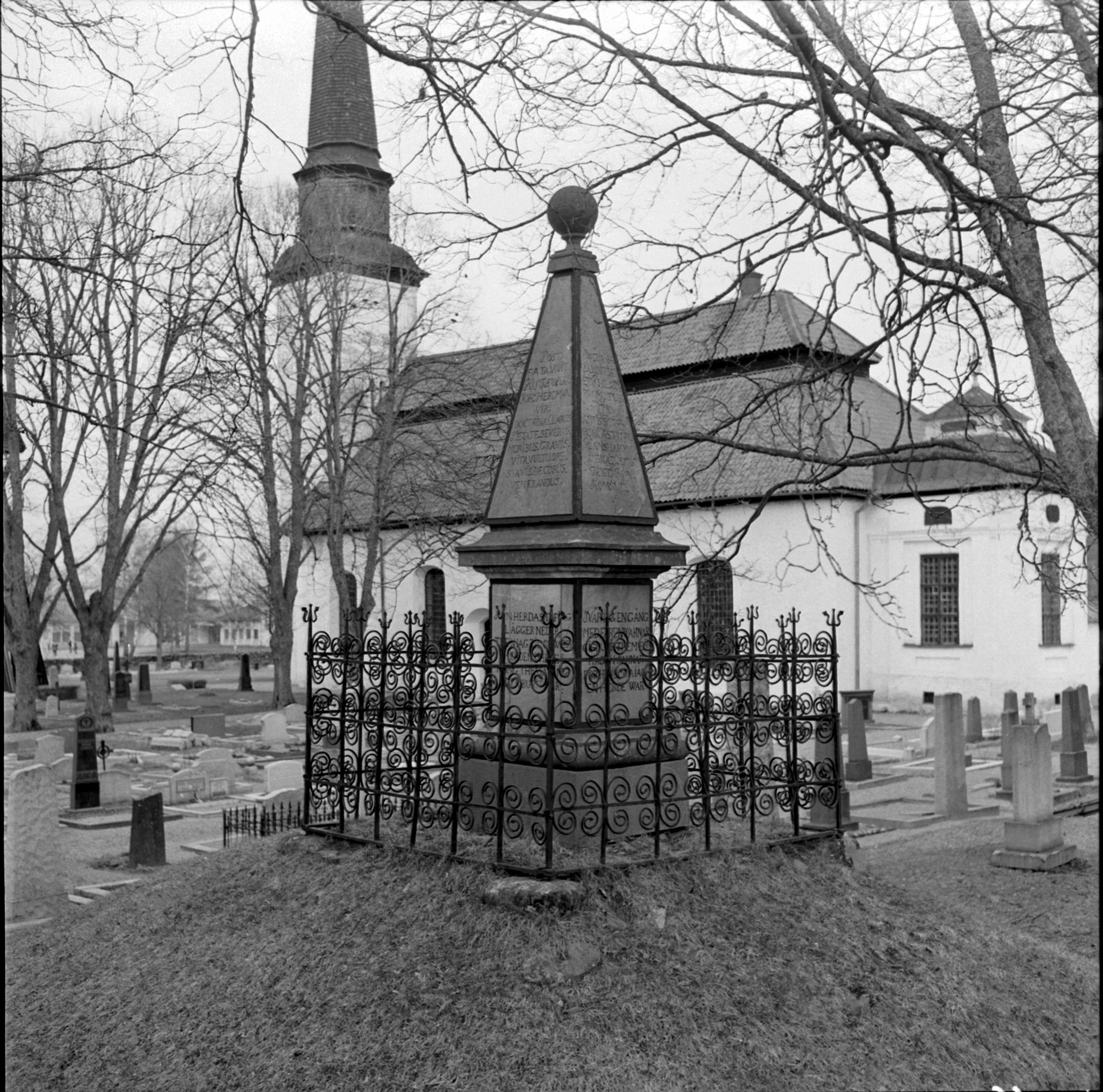 Kyrkan och kyrkoherden Gustaf Herdmans gravvård i förgrunden.