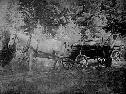 EN MAN KÖR EN VIT HÄST ANSPÄND FRAMFÖR EN VAGN LASTAD MED TIMMERSTOCKAR.
