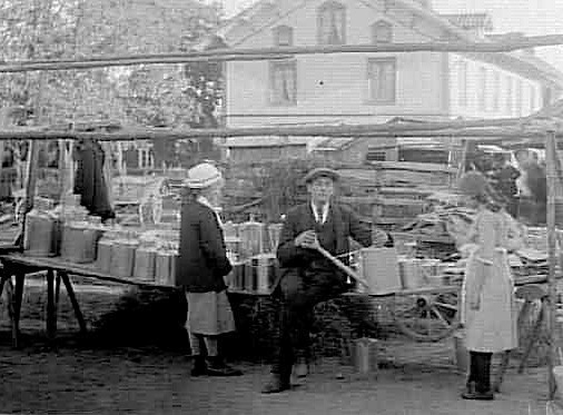 ETT FÖRSÄLJNINGSTÅND MED BLECKKÄRL PÅ TORGET I HOVA.