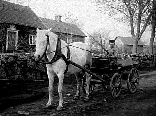 EN POJKE KÖR EN VIT HÄST OCH VAGN.