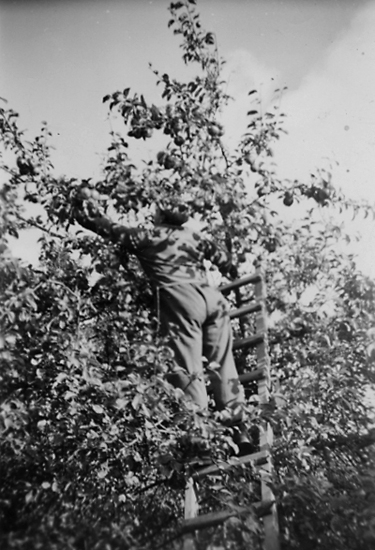 Heljesgårdens päronträd. Lars plockar ner päron 1940-talet.