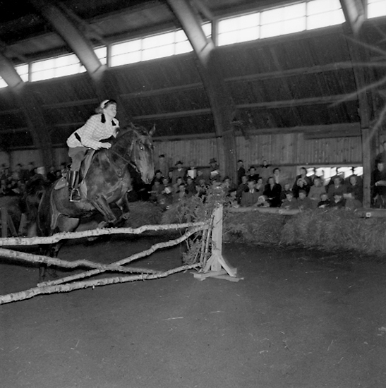 Ryttartävling i SKLS (Skaraborgs Läns Slakteriförening) uppvisningshall, Skara. 1/4 1951. Ryttare Gun Bogren.
