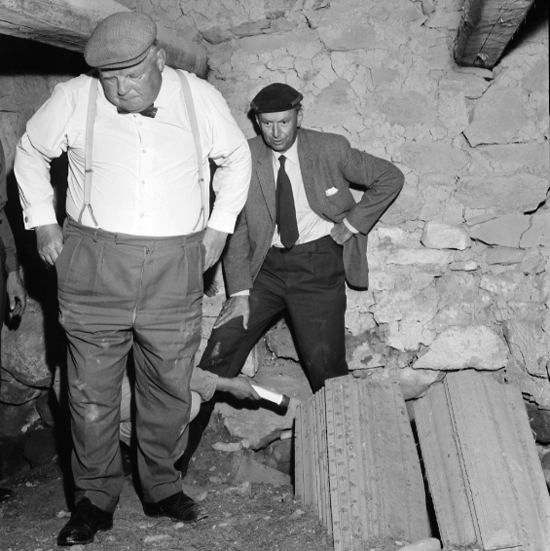 Landsantikvarie Ullenius och överste Bratt vid öppning av Brattska gravkoret på Senäte, Kållandsö, 1964.