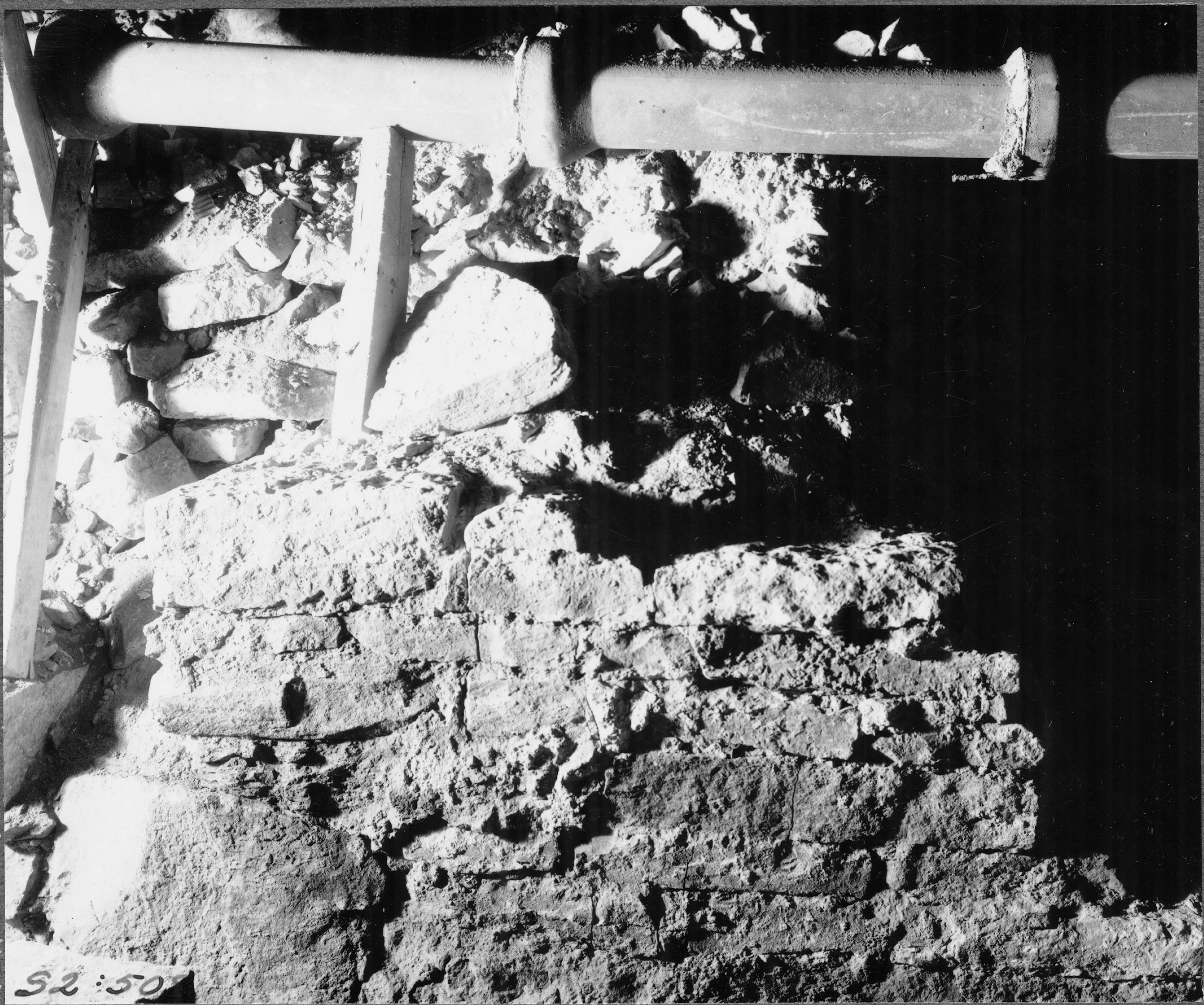 Grävning inom kyrkan, schakt X, äldsta triumfbågens södra upplag från norr.