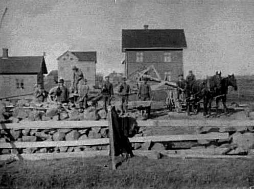 ARBETARE VID EN STENKROSS, DÄR ETT UPPFODRINGSVERK TRANSPORTERAR STENEN UPP PÅ EN HÄSTANSPÄND LASTVAGN.