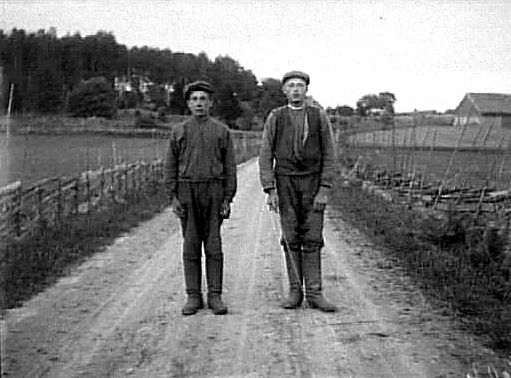 TVÅ MÄN PÅ EN LANDSVÄG OMGIVEN AV GÄRDESGÅRDAR.
