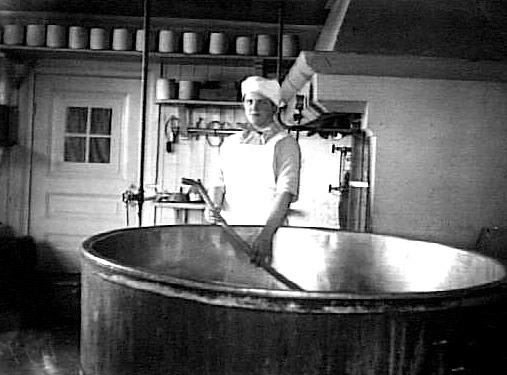 INTERIÖR FRÅN MEJERI. EN KVINNA STÅR INTILL YSTKARET OCH RÖR MED EN KÄPP I DETSAMMA.