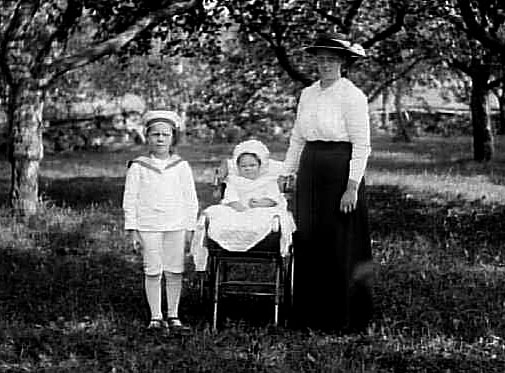 EN KVINNA OCH TVÅ BARN UTE I TRÄDGÅRDEN.
