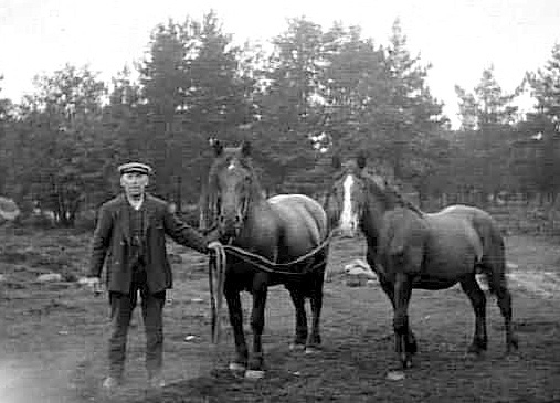 EN MAN HÅLLER TVÅ HÄSTAR I BETESHAGEN.