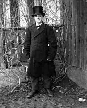 EN UNG MAN UTANFÖR VERANDAN I MÖRKA KLÄDER OCH HÖG HATT