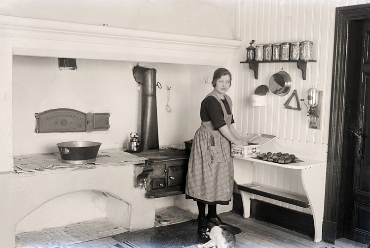 En kvinna plockar ned kakor i en burk i Lyrestads prästgårds kök.