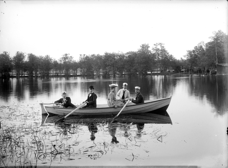 En dam, fyra herrar i roddbåt. Mycket högt vattenstånd.