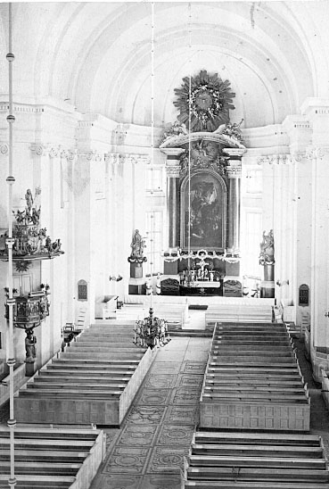 italienskinspirerade barockens främsta monument i Sverige. Den grundlades 1660 men fullbordades inte förrän strax efter 1700. Kyrkan är byggd av sten i långsträckt korsform med absider i öster och väster samt fyra lanterninkrönta torn i korsarmarnas vinklar. Fasaderna har pilastrar och gavlarna voluter m.m. av huggen sten. Även interiören är indelad med pilastrar. Altaruppsatsen från 1712 är utförd av Caspar Schröder efter Nicodemus Tessin d.y:s ritningar med altarmålning troligen av David von Krafft. Predikstolen har tillhört den gamla stadskyrkan - Storkyrkan - och