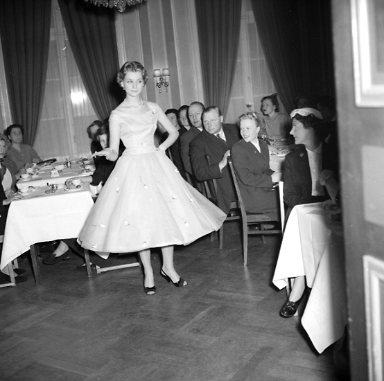 Titel: Mannekänguppvisning på Stadshotellet i Skara, 1958.