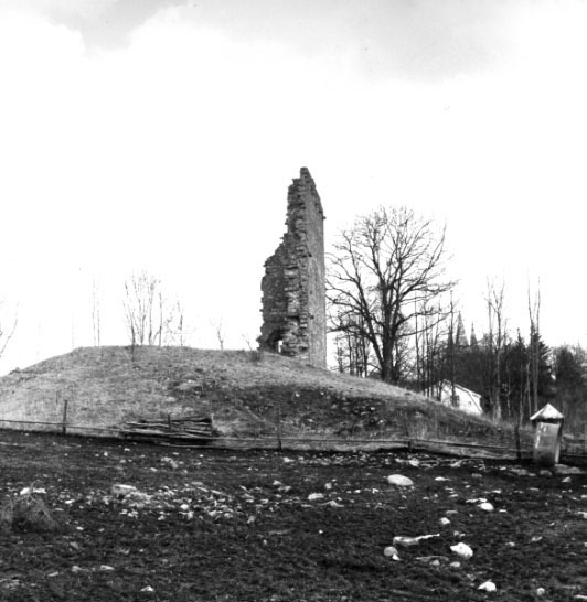 Titel: Husaby socken. Biskopsborgen från väster. Husaby biskopsborg uppfördes omkring 1400 av Brynolf Gerlaksson och förstördes kort tid efter reformationen. Det centrala tornhusets södra vägg kvarstår dock till full höjd. Borgen utgrävdes och konserverades under 1960-talet. http://www.ne.se/jsp/search/article.jsp?i_art_id=206431