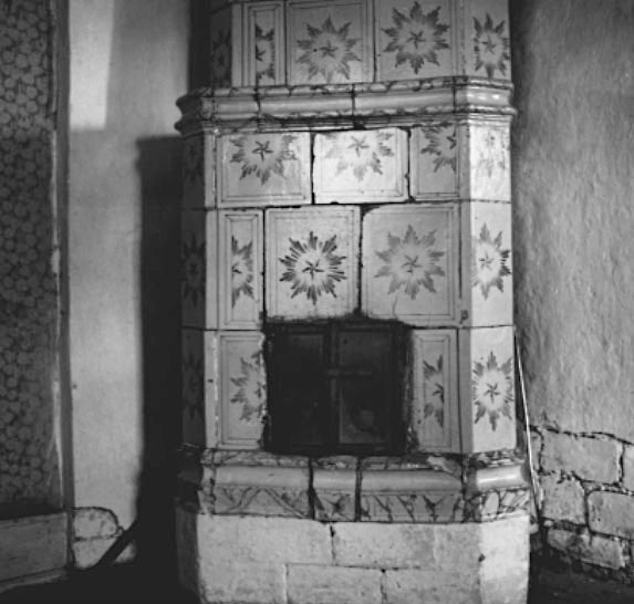 Skara, kv. Herrgården, Kråks herrgård. Östra flygeln. Kakelugn från Hallby, Storegården, Vänersnäs.