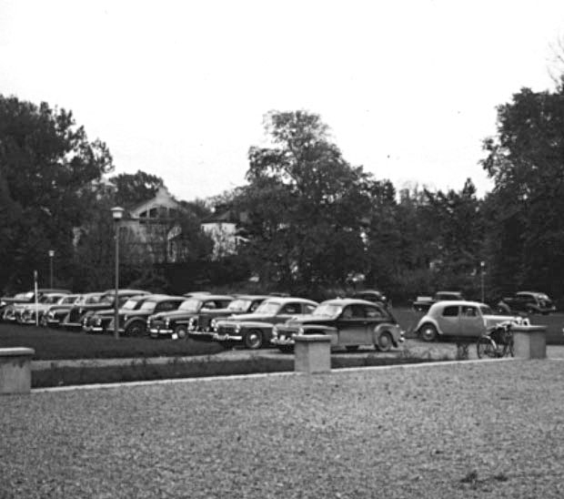 Skara, kv. Herrgården, Kråks herrgård. Parkerade automobiler vid Kråk en tisdagskväll sommaren -53.