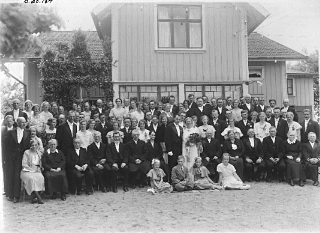 Titel: Frk Ester Brandberg, lärarinna i Vesene 1907, har bott i Skara mittemot Domkyrkan som barn, sedan på Klostergatan. Bröllop mellan Ragnhild, född Anderssson (1914-2000) och Pehr Bonander (1919-2003) utanför Ragnhilds föräldrarhem i Gudmundstorp, Vesene, Ljung, Herrljunga kommun. Bröllopet var den 6 juni 1936.