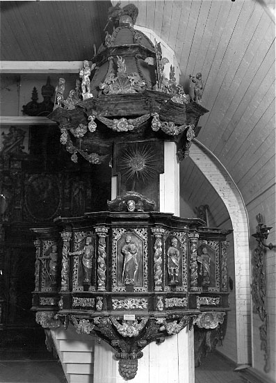 Museets samlingar. Skara domkyrkas predikstol från 1600-talets slut, uppställd i museets kyrksal på tredje våningen.