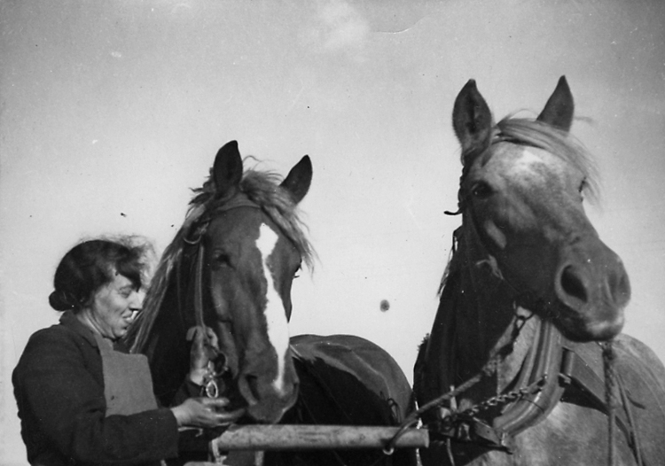 Elsa Eriksson med Heljesgårdens hästar vid potatisupptagningen 1940-talet.