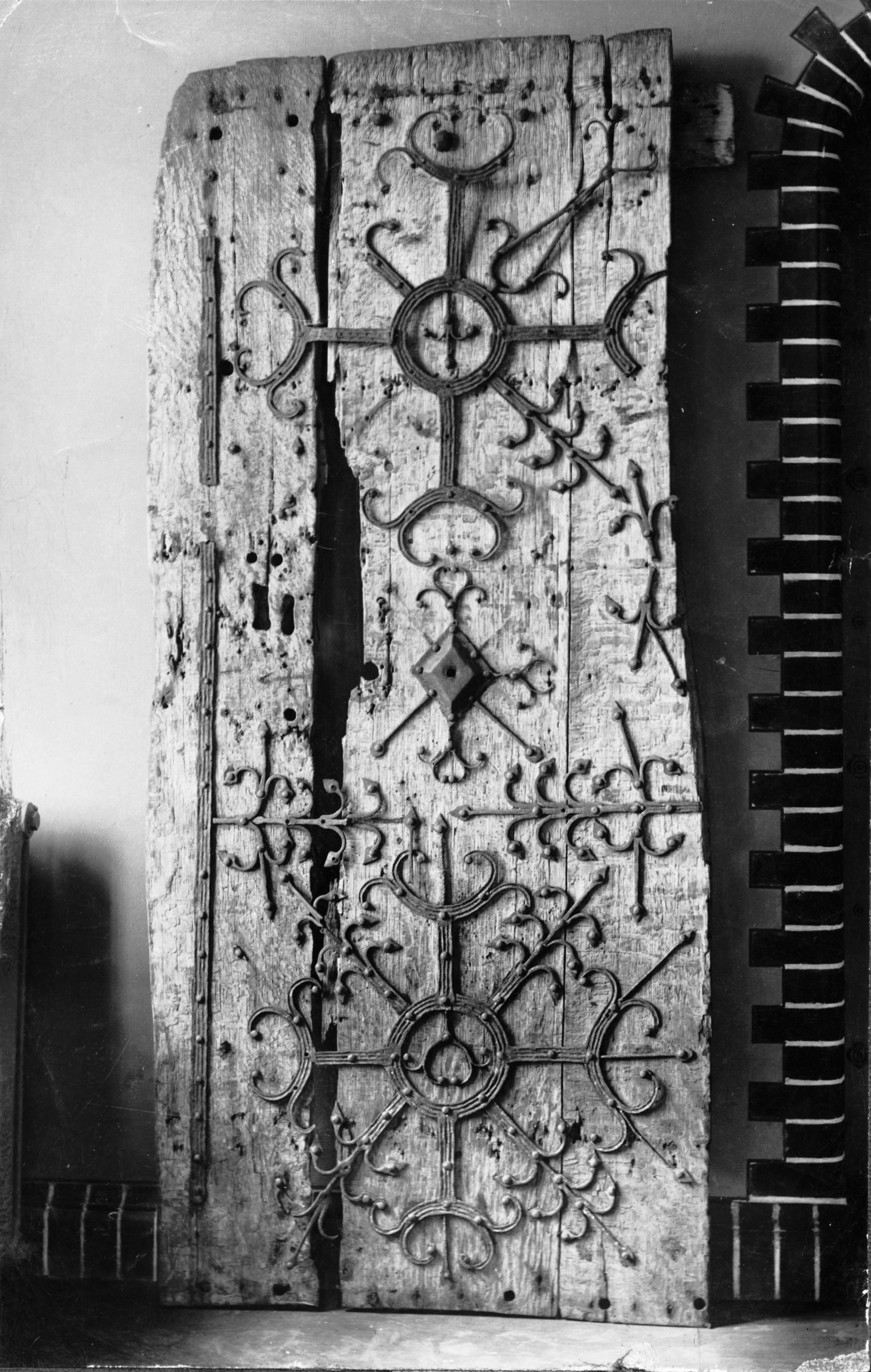 Kyrkdörr av ek, rikt järnbeslagen. Medeltida.