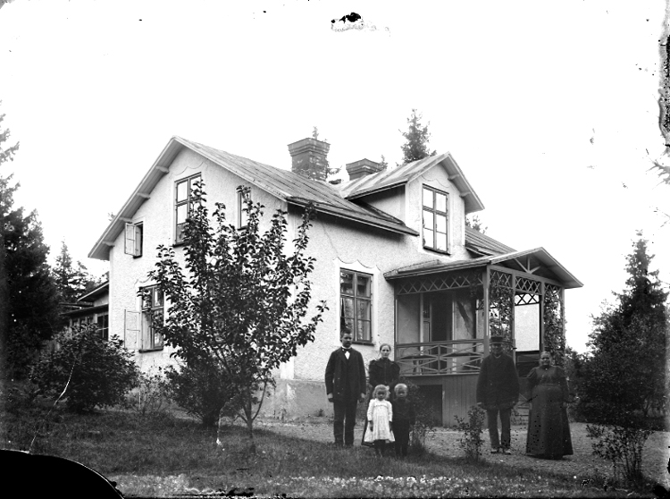 Två par och två barn framför vitt reveterat hus med stor veranda.