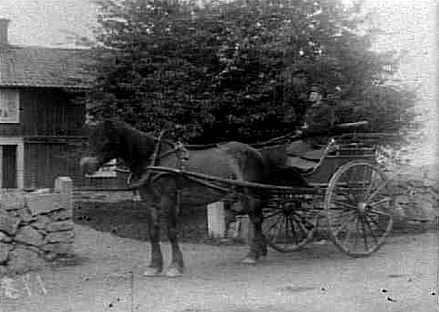 EN MAN MED ETT HÄSTÅK UTANFÖR ETT BOSTADSHUS