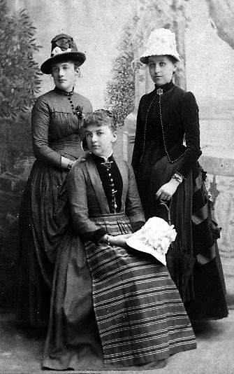 Hilma Ahlman (Sjöstedt), Nanny Sjöstedt (sittande), Anna Blomgren. Hjo år 1886.